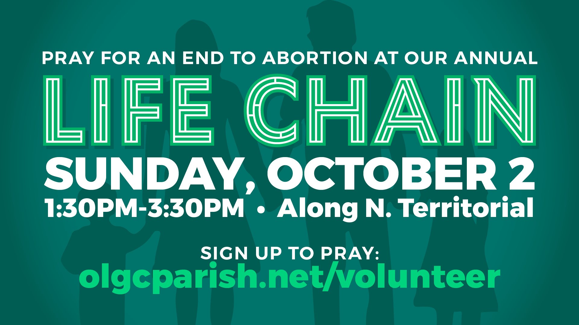 All LIFE CHAIN participants will be provided uniform pre-printed signs that gives the event it's name "LIFE CHAIN." We will be praying along N. Territorial Road, and it is very important that we cover as much of the route as possible, so please space yourself about 10 feet apart. See the back of each of the signs for the “Code of Conduct” for LIFE CHAIN.