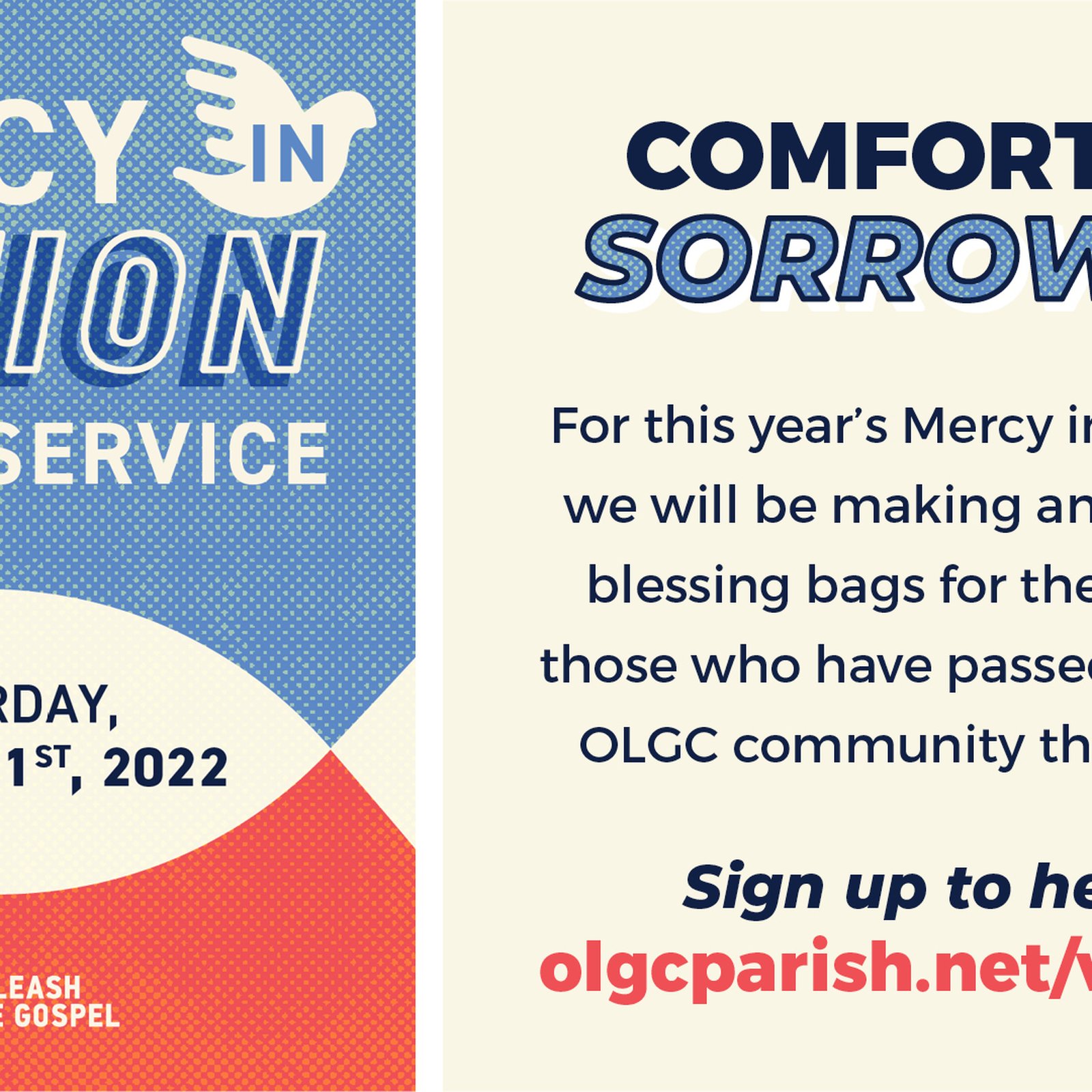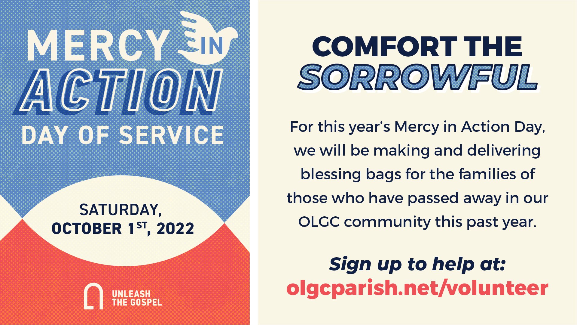 For this year’s annual Mercy in Action Day, we will be making and delivering blessing bags for the families of those who have passed away in our OLGC community this past year. Assembly will take place in the OLGC Social Hall starting at from 9:30am followed by home deliveries to the grieving families. If you have questions, please email Michelle Piccolo at [email protected].