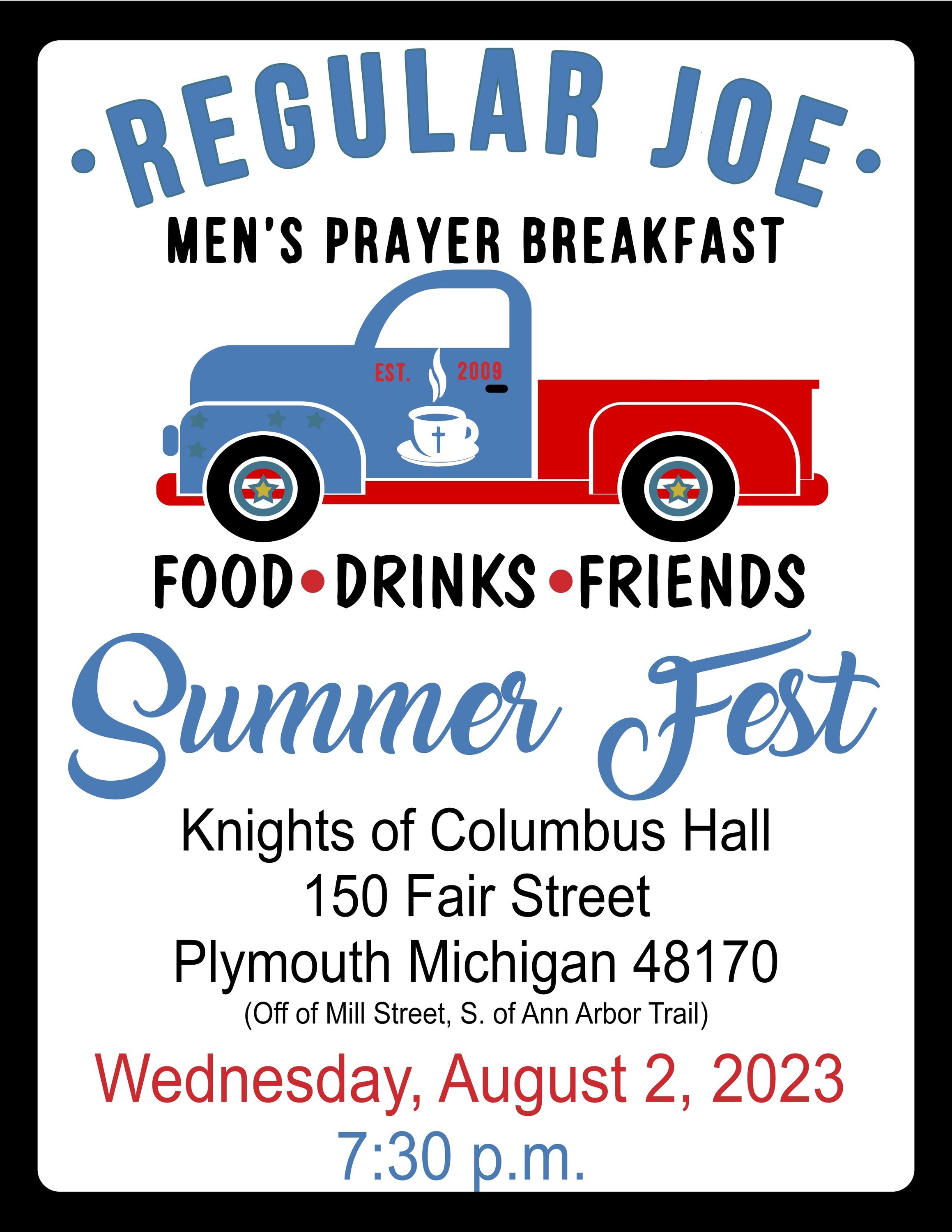 All men of the Parish are invited to Summer Fest, hosted by the OLGC Regular Joes Men’s Prayer Breakfast. Date: Wednesday, August 2, 2023 at 7:30 p.m. Location: Knights of Columbus Hall, 150 Fair Street; Plymouth, Michigan. Please join us for food, drink and fellowship!