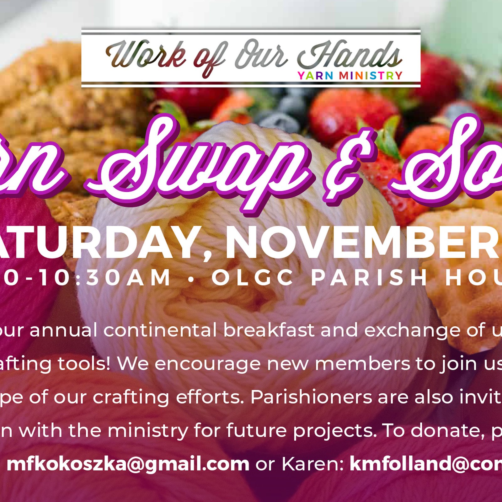 Work of our Hands holds an annual Continental breakfast with yarn swap at the November meeting, (second Saturday each month, 9-10:30), November 12, 2022 at the Parish House. We encourage potential new members to join us and discover the full scope of our crafting efforts. Besides conversation and a light breakfast, we exchange unused yarn, fabric and crafting tools. Parishioners are invited to share unneeded yarn to the ministry for future projects. To donate, contact Marilynn Kokoszka, [email protected] or Karen Folland, [email protected].