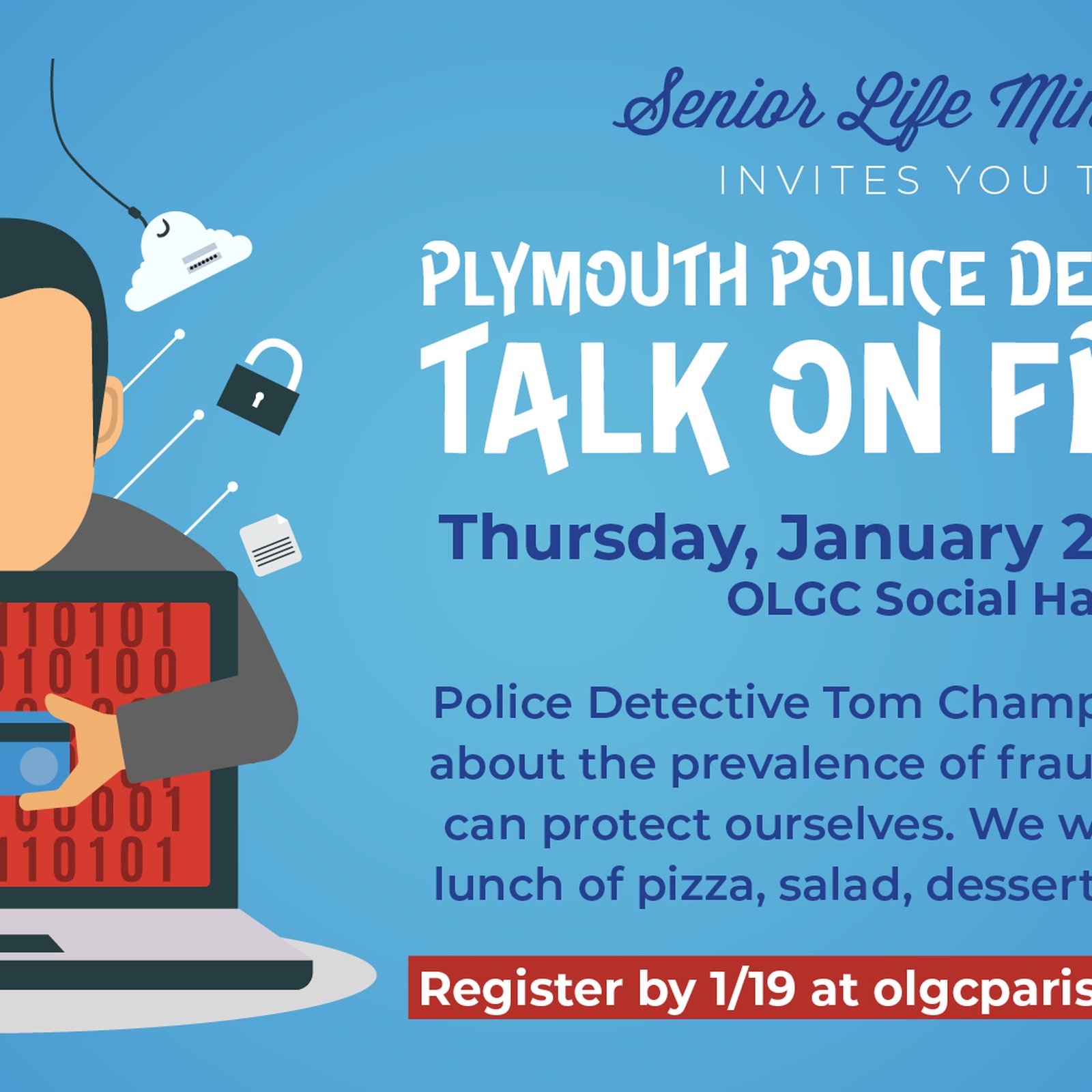 Police Sgt. will inform the Seniors about the large amount of fraud going on currently and how we can protect ourselves. We will also have lunch.