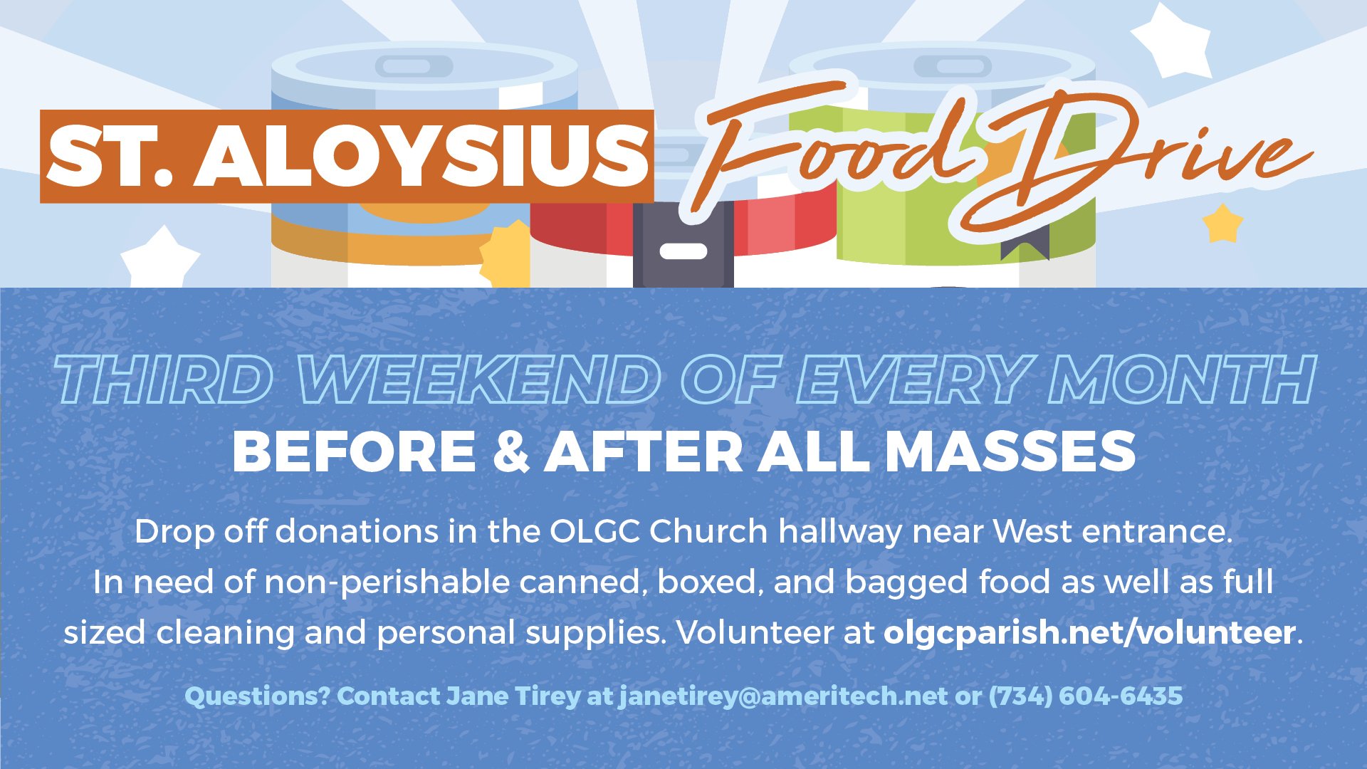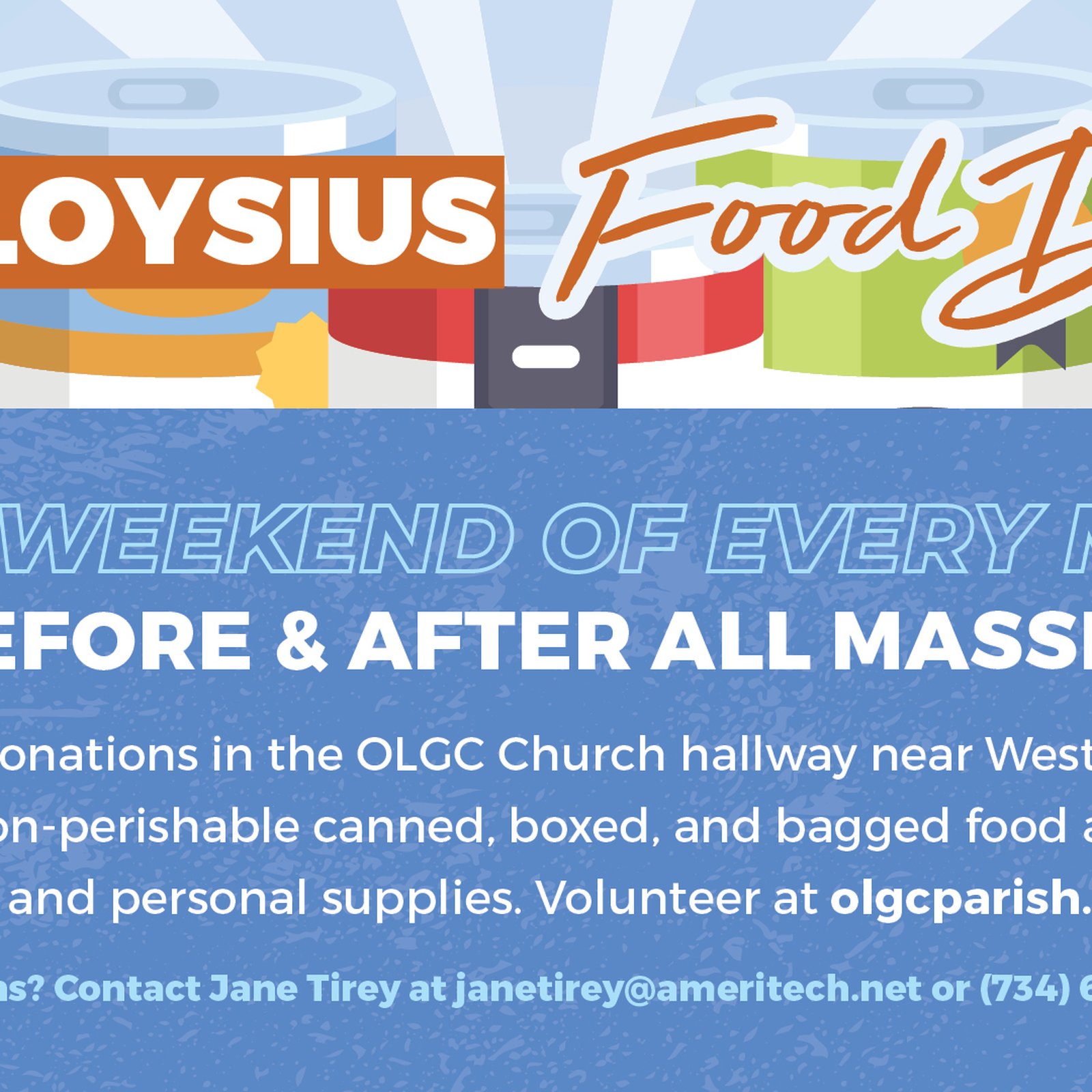 Drop off donations in the OLGC Church hallway near West entrance. In need of non-perishable canned, boxed, and bagged food as well as full sized cleaning and personal supplies.