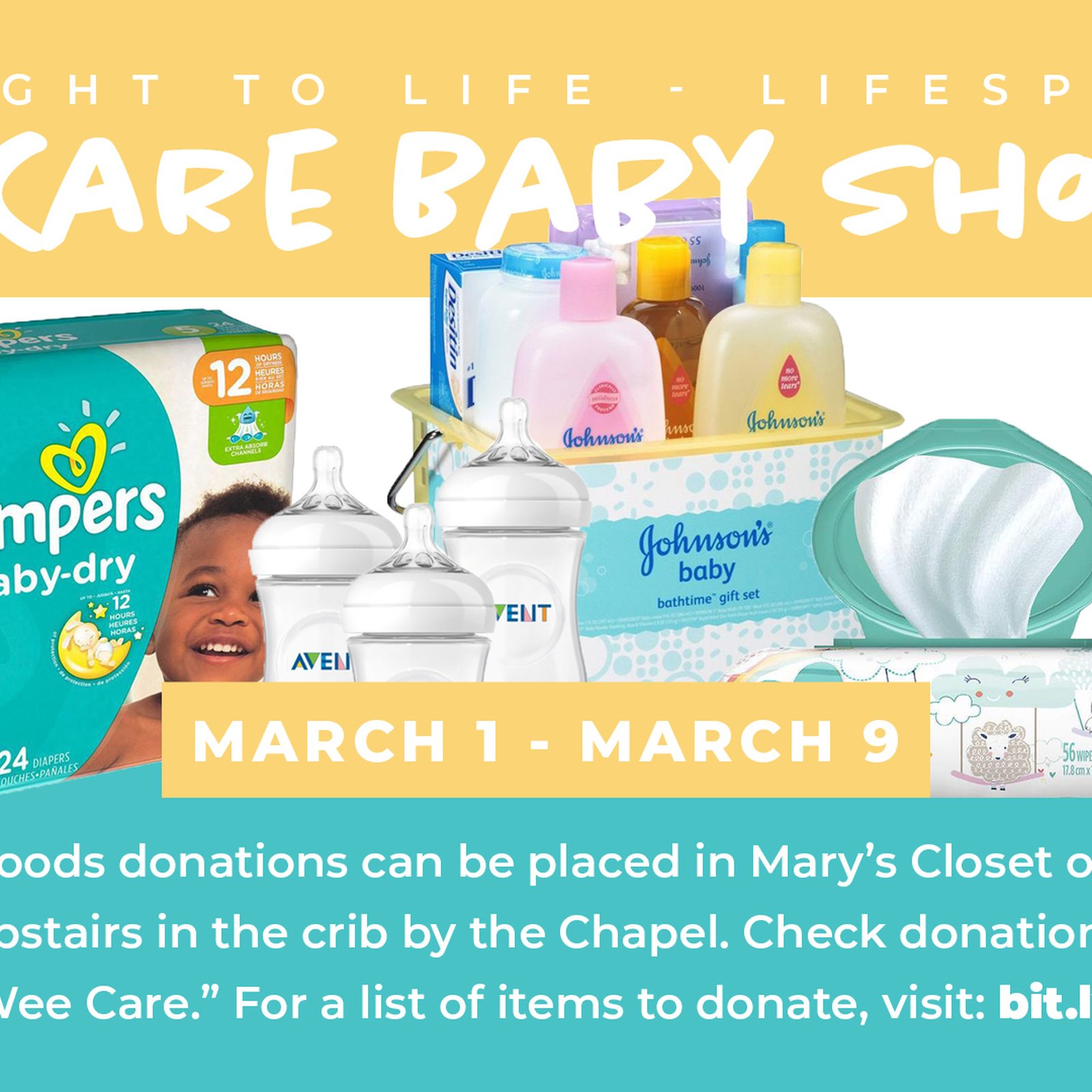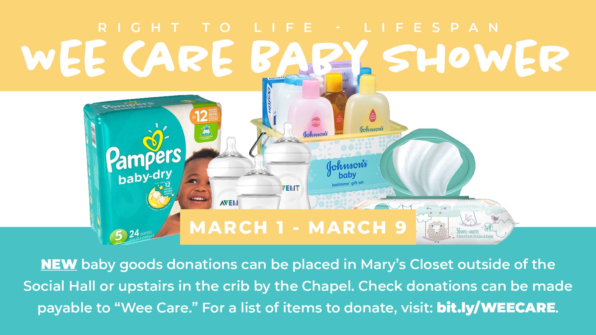 When you give a gift, you will be helping a mother and her child realize that both of their lives are precious and worth living. Donated items can be placed in Mary's Closet outside of the Social Hall from March 2-10. Check donations can be made payable to “Wee Care.” For a list of items to donate, visit bit.ly/WEECARE.